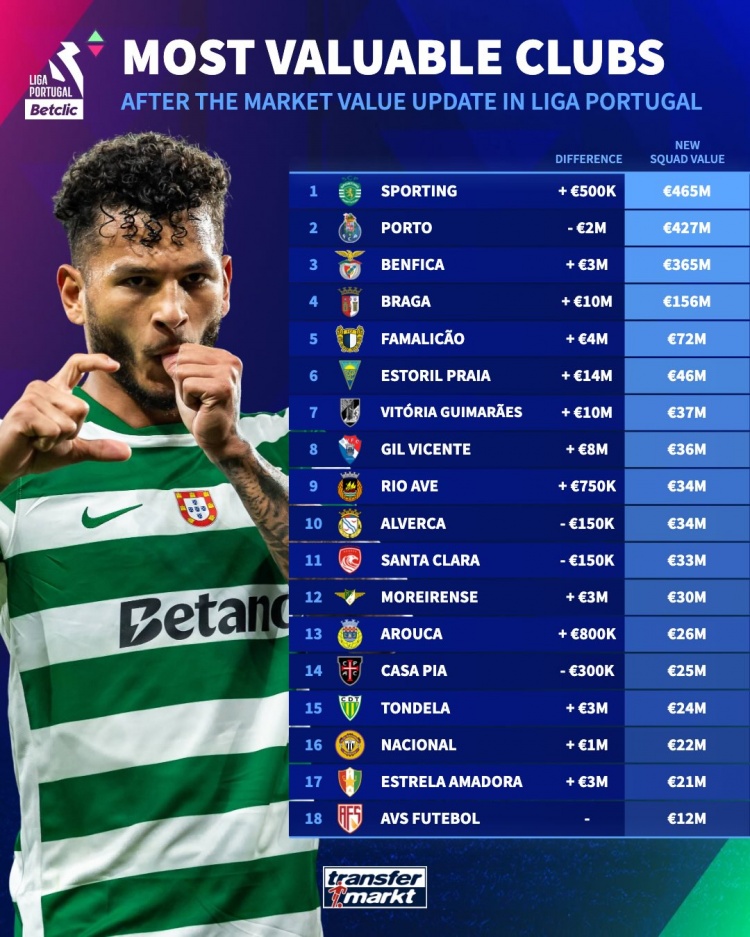 3月22日讯 德国转会市场列出了葡超俱乐部身价排名,葡萄牙体育、波尔图、本菲卡前三。
