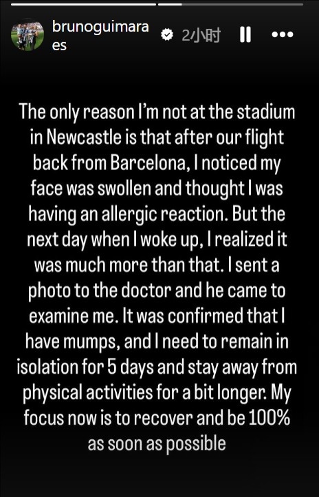 3月22日讯 吉马良斯通过社交媒体表示,自己因生病所以无法出战对阵桑德兰的比赛。吉马良斯写道:“我没有出现在纽卡斯尔球场的唯一原因是,从巴塞罗那飞回后,我发现脸部肿胀,起初以为是过敏反应。但第二天醒来,我意识到情况远比这严重。”“我把照片发给医生,他过来对我进行了检查。结果证实我患有腮腺炎,需要隔离5天,并在更长时间内停止体力活动。我现在专注于康复,争取尽快恢复到100%的状态。”