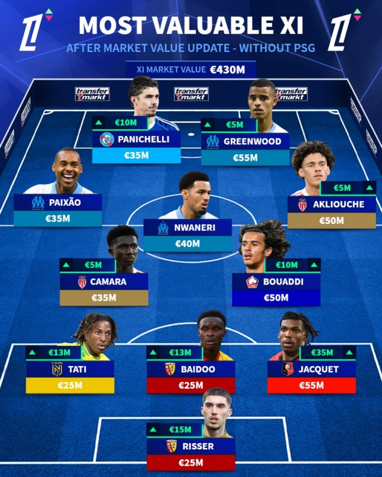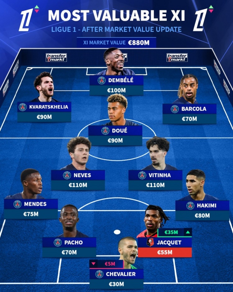 法甲身价最高阵容:登贝莱、内维斯、雅凯在列,巴黎10人入选