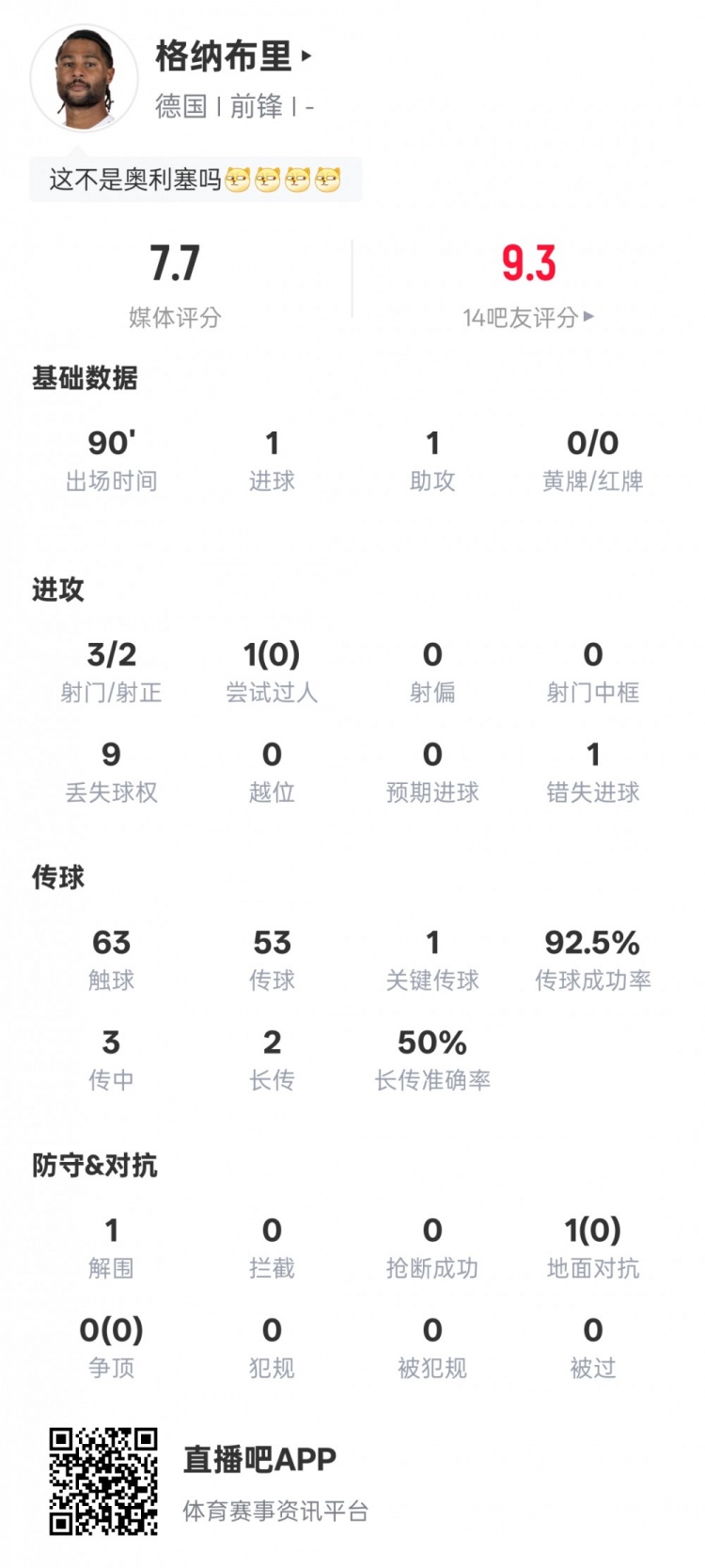 3月28日讯 国际足球友谊赛,德国4-3瑞士。格纳布里首发出战,传射建功,送出1次关键传球,传球成功率92.5%,不过也错失1次进球机会,评分7.7。格纳布里本场比赛数据:进球1助攻1射门3射正2过人1过人成功0丢失球权9错失进球机会1触球63传球53关键传球1传球成功率92.5%传中3长传2长传准确率50%解围1地面对抗1地面对抗成功0