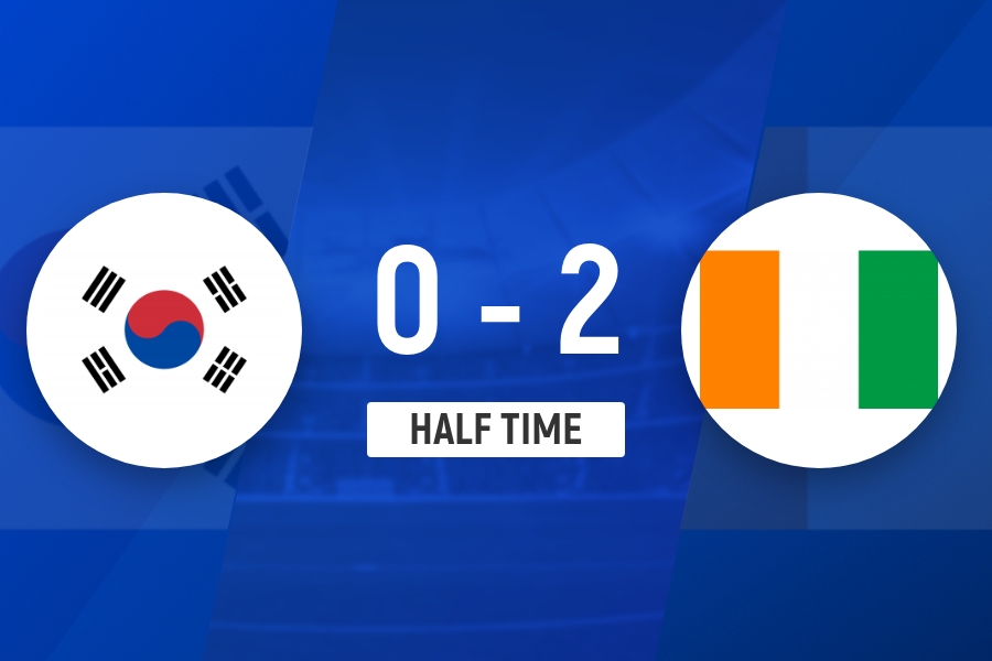 伤停补时3分钟。上半场比赛结束,韩国0-2科特迪瓦。