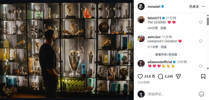 03月28日讯 萨拉赫今日更新社媒,晒出了自己望向奖杯柜的照片。33岁萨拉赫将在赛季末离开利物浦,结束9年红军生涯。截止目前,他为红军出战435场贡献255球122助,收获9个冠军。萨拉赫利物浦生涯核心荣誉团队荣誉:2次英超冠军、1次欧冠冠军、1次世俱杯冠军、1次欧超杯冠军、1次足总杯冠军、2次联赛杯冠军、1次社区盾杯冠军。个人荣誉:4次英超金靴、3次PFA年度最佳球员、2次非洲足球先生、1次普斯卡什奖。