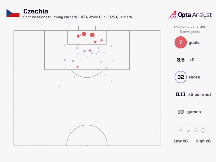 世预赛欧洲区比赛,捷克已经通过角球打进7球,位居欧洲区所有球队之首。