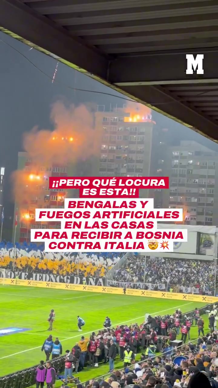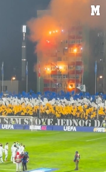 主场迎战意大利,波黑球迷在球场旁建筑物燃放焰火和烟花加油助威