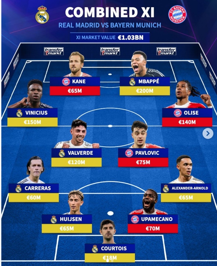 4月7日讯 北京时间明天凌晨,皇马将在欧冠1/4决赛首回合比赛中主场对阵拜仁。德国转会市场列出了皇马+拜仁阵容。德转列皇马+拜仁阵容(总价10.3亿欧)门将:库尔图瓦(1800万欧)后卫:卡雷拉斯(6000万欧)、赫伊森(6500万欧)、于帕梅卡诺(7000万欧)、阿诺德(6500万欧)中场/边锋:维尼修斯(1.5亿欧)、巴尔韦德(1.2亿欧)、帕夫洛维奇(7500万欧)、奥利塞(1.4亿欧)前锋:凯恩(6500万欧)、姆巴佩(2亿欧)