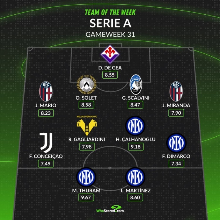 whoscored本轮意甲最佳阵:图拉姆领衔国米4将 孔塞桑、德赫亚在列