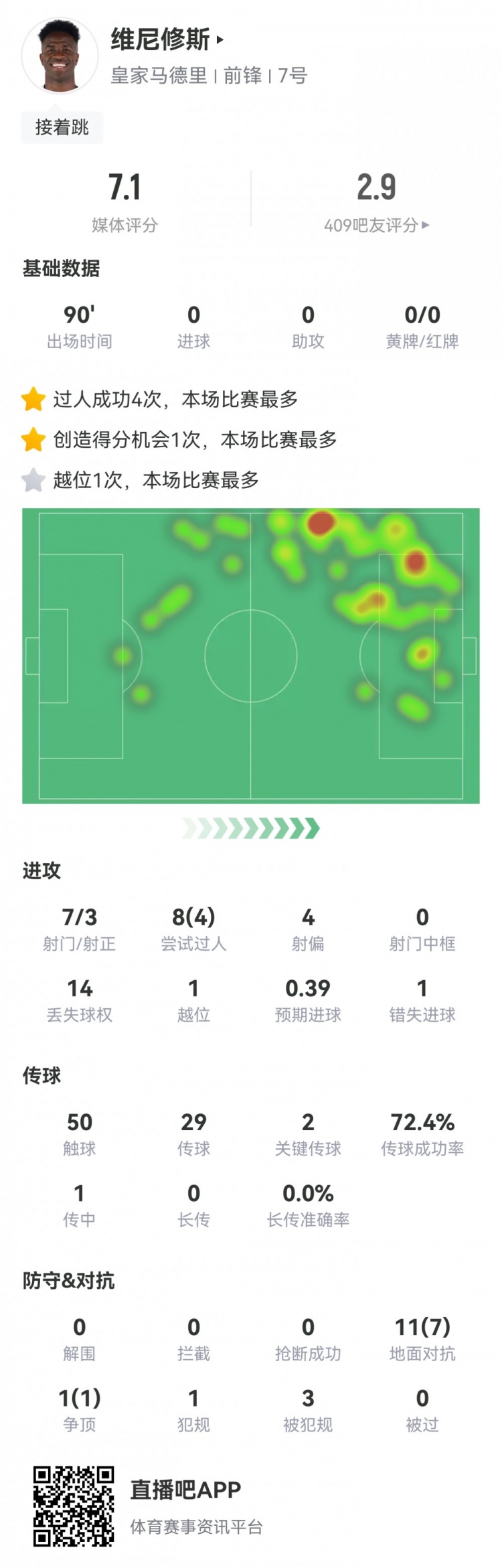 维尼修斯数据:7射3正4过人,2次关键传球,1次错失进球,评分7.1