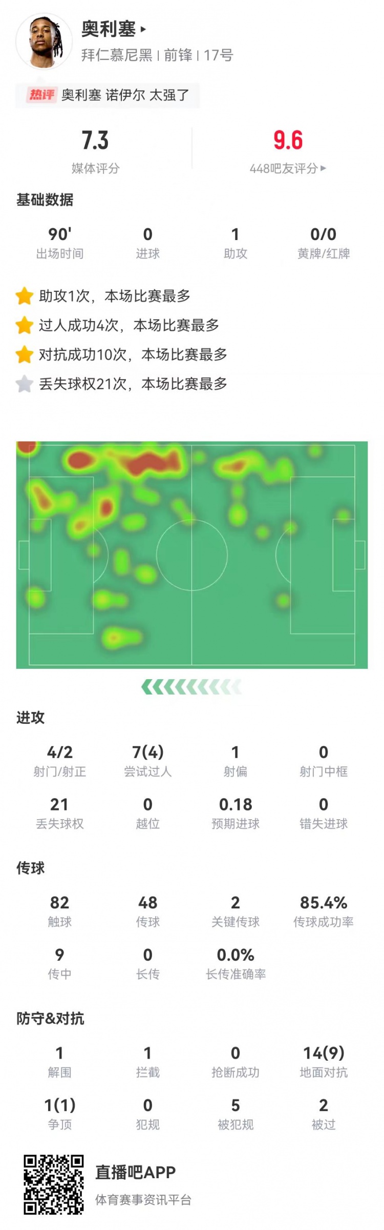 4月8日讯 拜仁在本轮欧冠2-1击败皇马,奥利塞本场数据如下:首发踢满全场1助攻4射2正7过人、4成功21丢失球权预期进球0.1882触球48传球、成功率85.4%2关键传球9传中1解围1拦截15对抗、10成功5造犯规2犯规获评7.3分