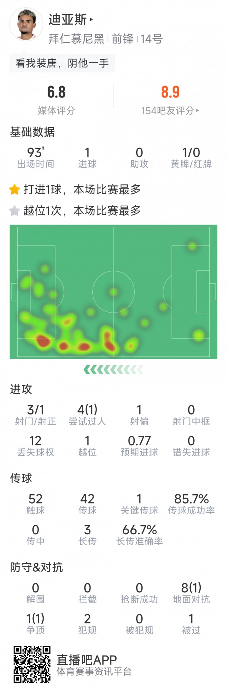 4月8日讯 在欧冠淘汰赛拜仁对皇马的比赛中,迪亚斯破门,以下为他在本场数据: