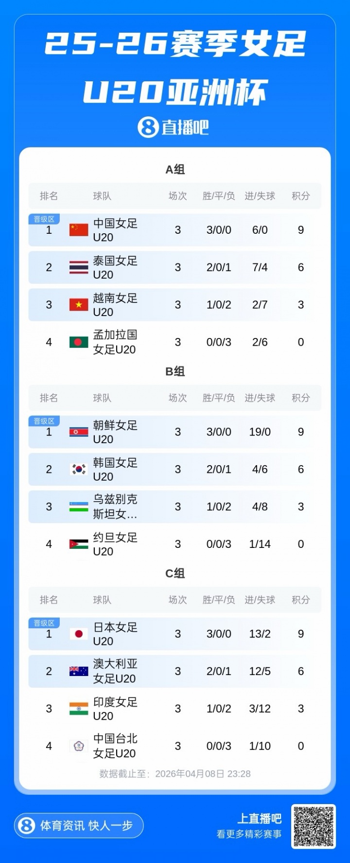U20女足亚洲杯1/4决赛对阵:中国vs乌兹别克斯坦,朝鲜vs澳大利亚