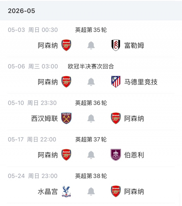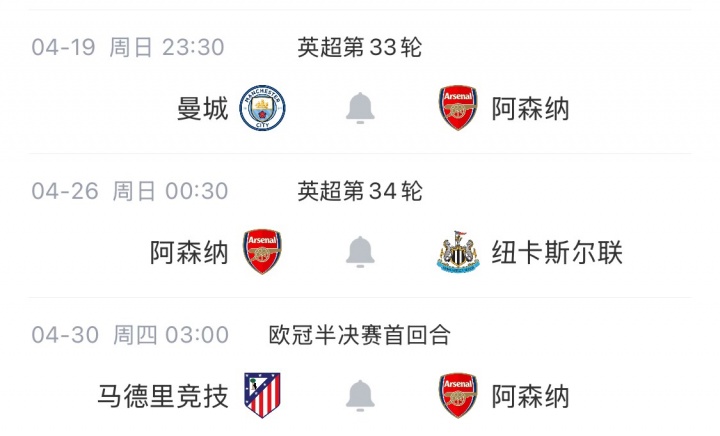 04月16日讯 阿森纳淘汰葡萄牙体育,晋级欧冠半决赛,继续在英超和欧冠双线争冠。4月剩余比赛中,阿森纳将接连迎来曼城、纽卡和马竞的挑战。