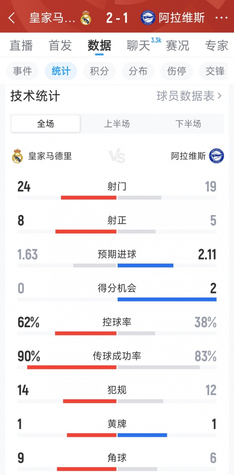 4月22日讯 在本轮西甲,皇马2-1击败阿拉维斯,以下为双方全场数据对比:皇马vs阿拉维斯射门:24-19射正:8-5预期进球:1.63-2.11得分机会:0-2控球率:62%-38%传球成功率:90%-84%犯规:14-12黄牌:1-1角球:9-6