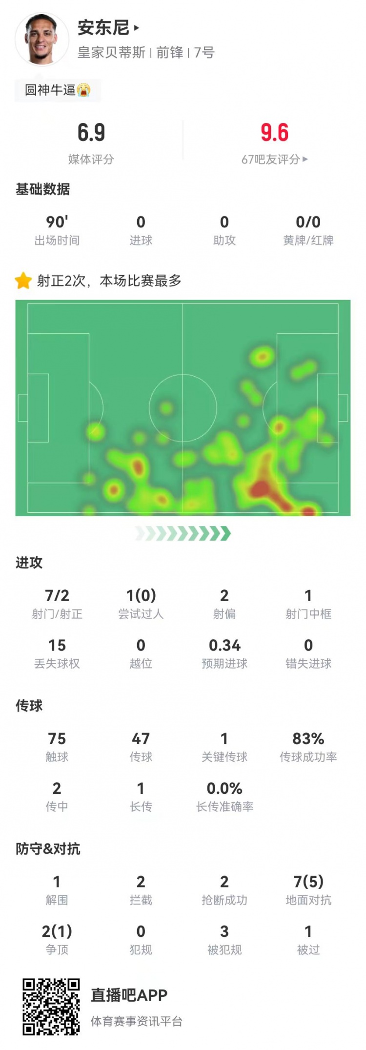 4月25日讯 贝蒂斯在本轮西甲对阵皇马,安东尼本场数据如下:首发踢满全场7射2正1中框预期进球0.341过人、0成功15丢失球权75触球47传球,成功率83%1关键传球2传中1长传、0成功1解围2拦截2抢断9对抗、6成功3造犯规1被过获评6.9分