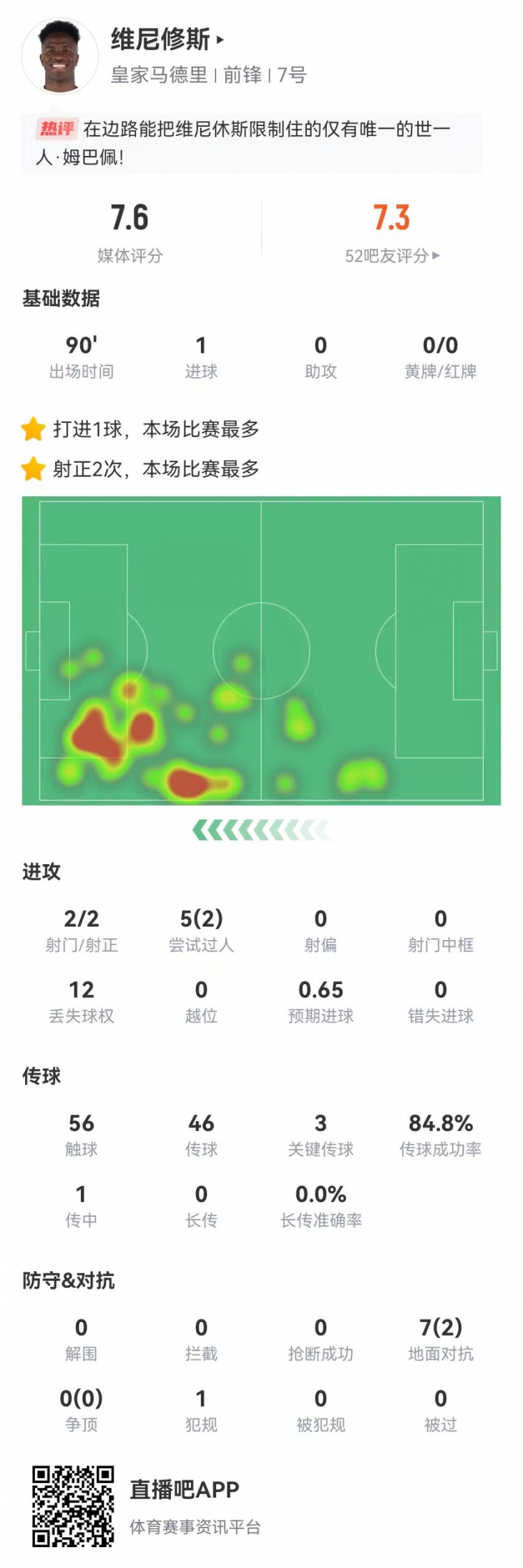 4月25日讯 皇马在本轮西甲对阵贝蒂斯,维尼修斯本场数据如下:首发踢满全场1球2射2正5过人、2成功12丢失球权预期进球0.6556触球46传球,成功率84.8%3关键传球1传中7对抗、2成功1犯规获评7.6分