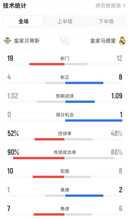 4月25日讯 西甲第32轮,贝蒂斯主场1-1绝平皇马。全场比赛数据如下:射门19-12射正4-8预期进球1.02-1.09进球机会0-1控球率52%-48%传球成功率90%-86%犯规10-8黄牌1-2角球7-6