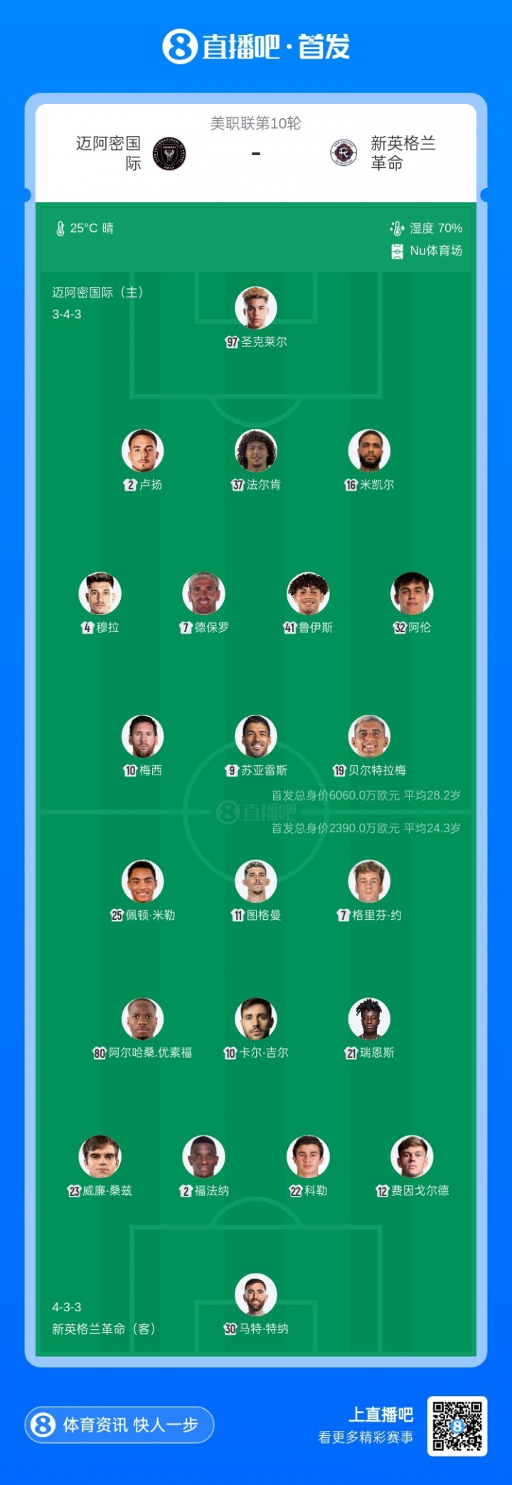 04月26日讯 美职联第10轮,迈阿密国际对阵新英格兰革命,赛前首发公布。