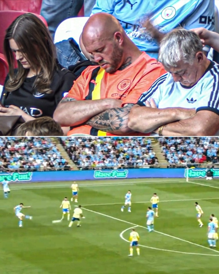 足总杯半决赛,场边两名曼城球迷睡得正香呢