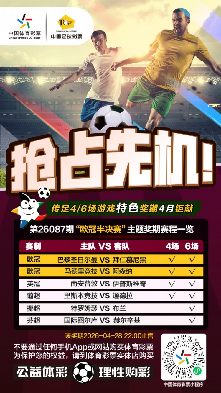 第26087期传足4/6场游戏特色奖期已经于2026年4月26日20:00开售,将于2026年4月28日22:00停售,并于2026年4月30日开奖,其中巴黎圣日尔曼VS拜仁慕尼黑、马德里竞技VS阿森纳、南安普敦VS伊普斯维奇、里斯本竞技VS通德拉为4场进球游戏竞猜赛事。