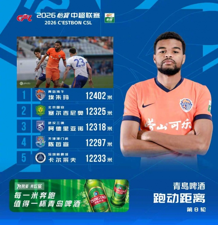 4月28日讯 中超联赛官方公布了第8轮球员跑动榜,青岛海牛外援埃朱玛跑动距离达到12402米,排名本轮跑动距离榜首位。此外,塞尔吉尼奥、阿德里亚诺、陈哲宣、卡尔采夫进入跑动榜前五。中超联赛第8轮跑动榜1 埃朱玛 青岛海牛 12402米2 塞尔吉尼奥 北京国安 12325米3 阿德里亚诺 武汉三镇 12318米4 陈哲宣 天津津门虎 12297米5 卡尔采夫 深圳新鹏城 12233米
