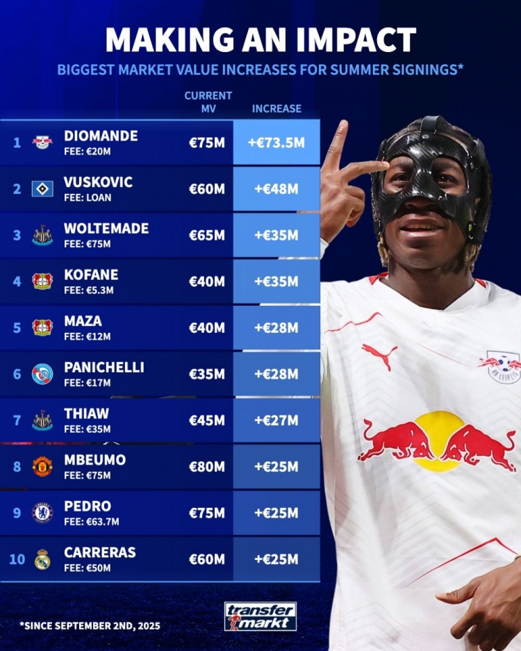 去年夏窗签约球员身价上涨榜:扬·迪奥曼德居首,武什科维奇次席