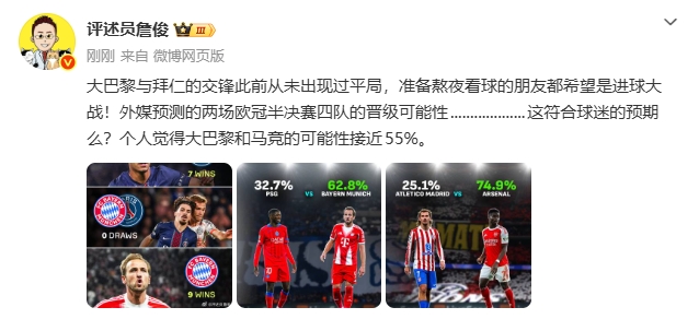04月28日讯 欧冠半决赛首回合的比赛即将打响,知名评述员詹俊在个人社媒分享了他对今晚大巴黎对阵拜仁以及最终晋级决赛的两支队伍的看法。詹俊:大巴黎与拜仁的交锋此前从未出现过平局,准备熬夜看球的朋友都希望是进球大战!外媒预测的两场欧冠半决赛四队的晋级可能性...................这符合球迷的预期么?个人觉得大巴黎和马竞的可能性接近55%。