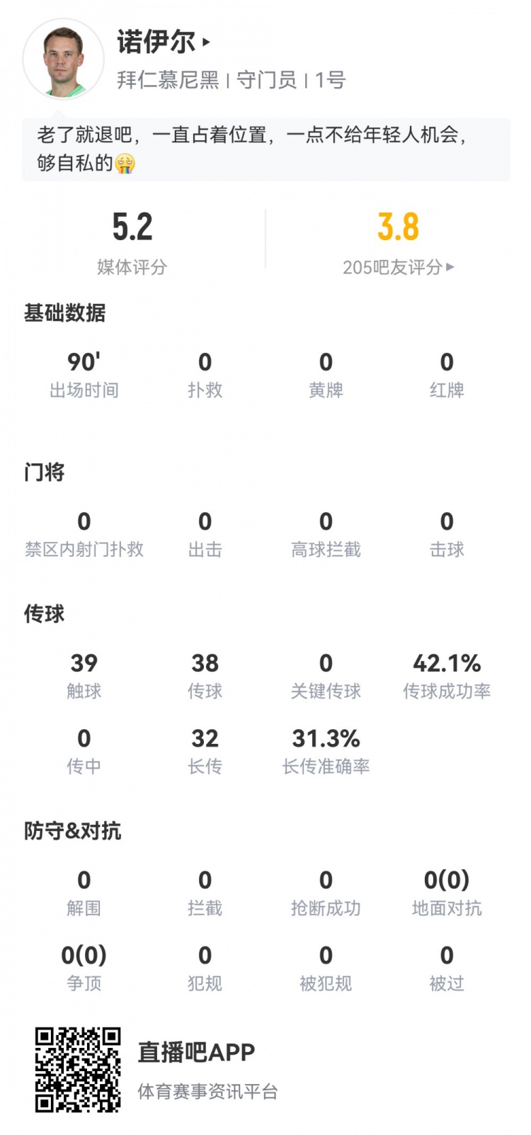 4月29日讯 欧冠半决赛首回合,巴黎5-4拜仁。此役拜仁门将诺伊尔首发打满全场,球员全场重点数据如下↓0次扑救0次禁区内射门扑救0次出击0次高球拦截0次击球39次触球传球成功率42.1%32次长传长传成功率31.3%评分仅5.2全场最低