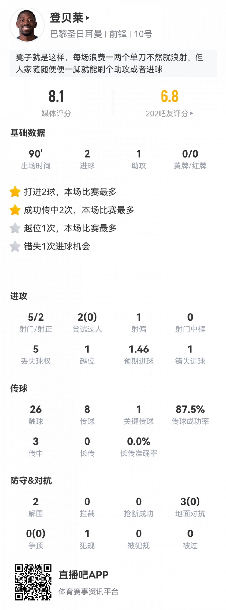 4月29日讯 欧冠半决赛首回合,巴黎5-4拜仁。登贝莱首发打满全场,球员全场重点数据如下↓5射2正2粒进球1次助攻2次过人成功0次5次丢失球权预期进球1.461次错失进球26次触球传球成功率87.5%1次关键传球3次对抗成功0次2次解围1次抢断评分8.1