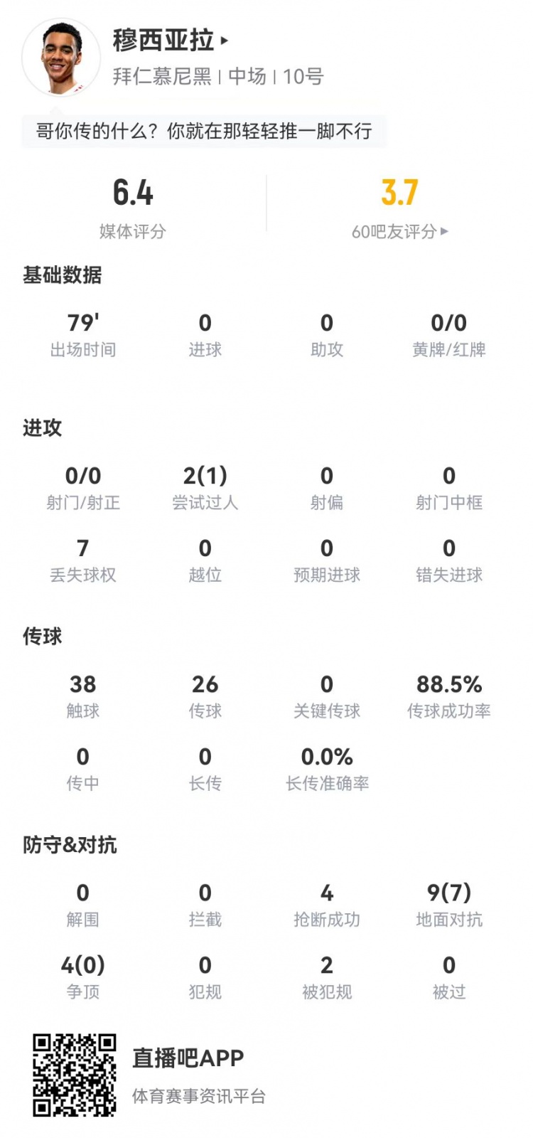 4月29日讯 拜仁在本轮欧冠对阵巴黎,穆西亚拉本场数据如下: