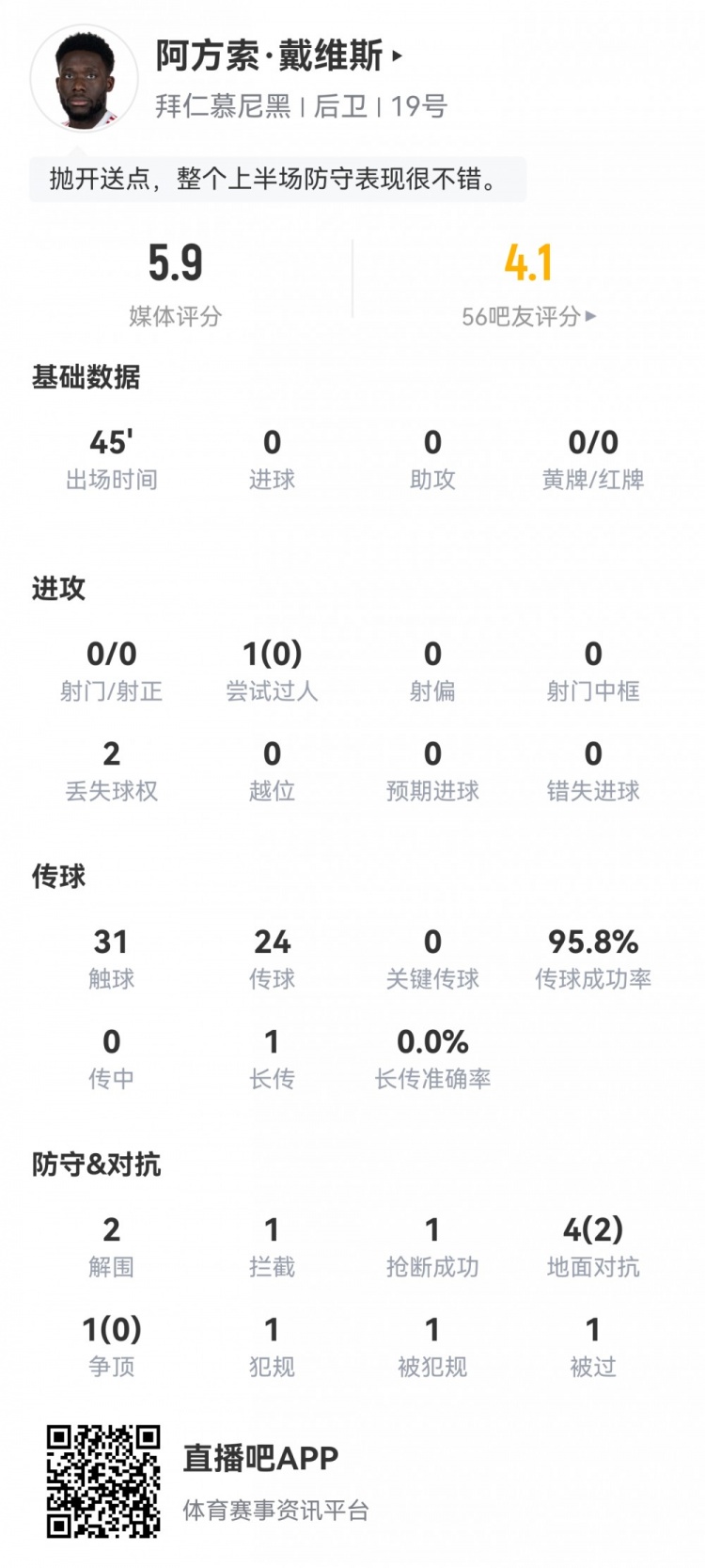 4月29日讯 欧冠半决赛首回合,巴黎半场3-2拜仁。阿方索·戴维斯半场被换下,球员重点数据如下↓0射0正1次送点1次过人成功0次2次丢失球权31次触球传球成功率95.8%5次对抗成功2次2次解围1次拦截1次抢断评分仅5.9